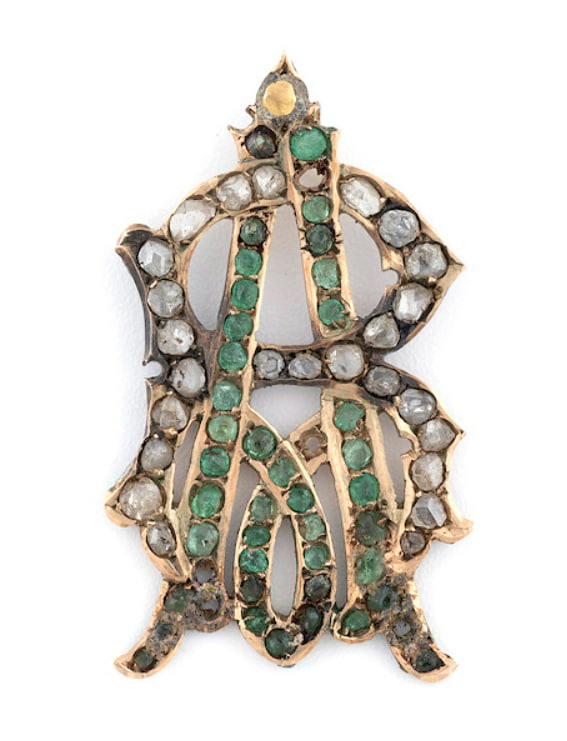 Murassa, elmas ve zümrüt taşlar ile bezeli, Latin harfleri "A.R" yazılı altın inisiyali.