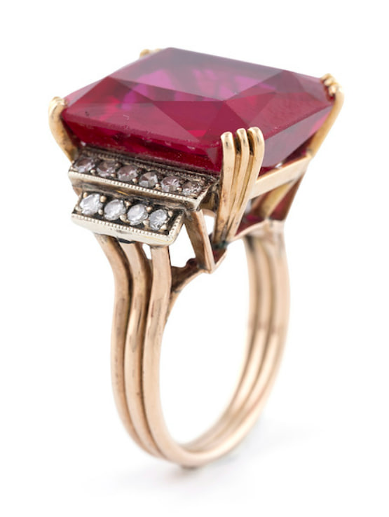 22 karat yakut, elmas kakma altın yüzük. Yakut (ruby), dikdörtgen (rectangular) kesim ve pembemsi kırmızı (pinkish red) renkte olup laboratuvar (lab grown) üretimi.