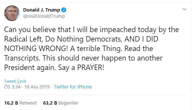 “İnanabiliyor musunuz bugün radikal son tarafından, hiçbir şey yapmayan Demokratlar tarafından azledileceğim ve YANLIŞ HİÇBİR ŞEY YAPMADIM! Korkunç bir şey. Telefon dökümlerini okuyun. Bu başka hiçbir başkanın başına gelmemeli. Dua edin!”