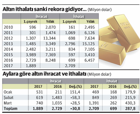 Türkiye yıllık bazda altın ithalatı rekorunu 15 milyar dolarla 2013 yılında kırmıştı. O yılın ilk çeyreğindeki ithalat da 2.8 milyar dolar olmuştu. Yani bu yılın ilk çeyreğinde, rekor yılındakine çok yakın bir ithalat gerçekleştirmiş olduk.