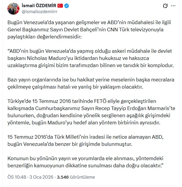 MHP Genel Başkan Yardımcısı İsmail Özdemir, Venezuela’da yaşanan gelişmelerle ilgili MHP Genel Başkanı Devlet Bahçeli’nin bir televizyon kanalına yaptığı açıklamayı sanal medya hesabından paylaştı. Özdemir’in paylaşımına göre Bahçeli şu ifadeleri kullandı;