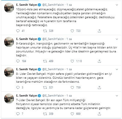 MHP Genel Başkanı Semih Yalçın, kişisel Twitter hesabında MHP Genel Başkanı Devlet Bahçeli'nin bazı mesajlarını takipçilerine aktardı. Buna göre sözlerine "Başkaları için hiç olmayan mesafeler ‘Üç Hilal’ için hep vardı ve sarp yollar, keskin dönemeçler, imkansız geçitler hep karşımıza çıkarıldı. Sürekli yokuşlarda susadık, dar patikalarla sınandık, ateş çemberiyle imtihana çekildik" diye başlayan Bahçeli, şöyle devam etti: