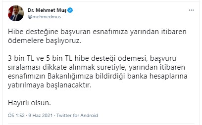 3 bin TL ve 5 bin TL hibe desteği ödemesi, başvuru sıralaması dikkate alınmak suretiyle, yarından itibaren esnafımızın Bakanlığımıza bildirdiği banka hesaplarına yatırılmaya başlanacaktır.