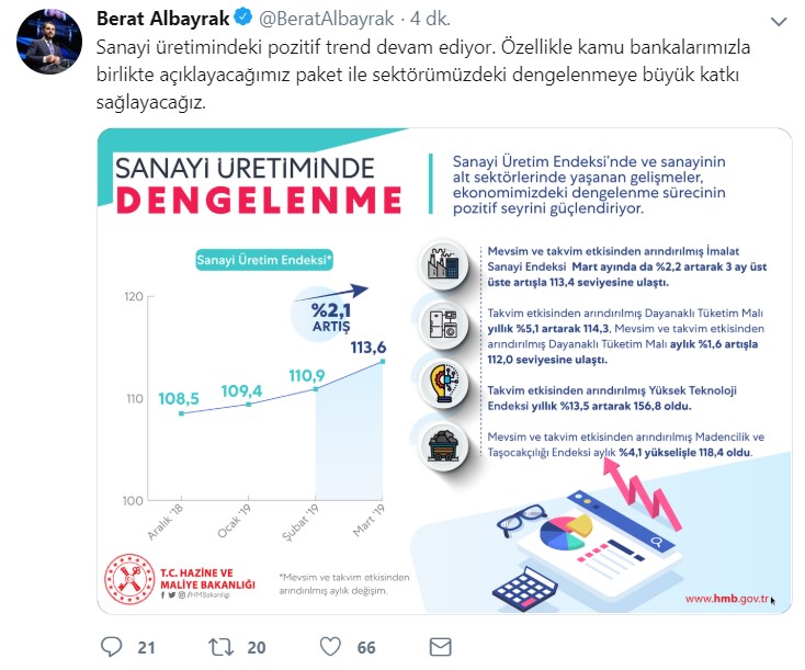 Hazine ve Maliye Bakanı Berat Albayrak sanayi üretimi verisini değerlendirdi. Sanayi üretiminde pozitif trendin devam ettiğini belirten Albayrak "Özellikle kamu bankalarımızla birlikte açıklayacağımız paket ile sektörümüzdeki dengelenmeye büyük katkı sağlayacağız" yorumunu yaptı.