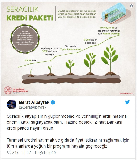 Hazine ve Maliye Bakanı Berat Albayrak, Twitter hesabından "Seracılık Kredi Paketi"ne ilişkin değerlendirmede bulundu.