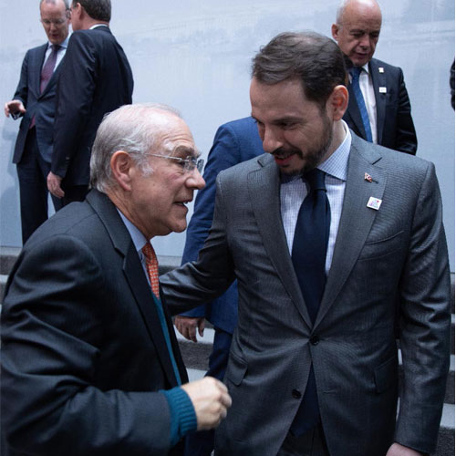 Bakan Albayrak, çekim öncesinde yanında bulunan OECD Genel Sekreteri Angel Gurria ve diğer katılımcılarla bir süre sohbet etti.