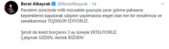 Hazine ve Maliye Bakanı Berat Albayrak, Twitter hesabından kredi erteleme kararına ilişkin bir paylaşımda bulundu.