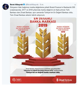 Hazine ve Maliye Bakanı Berat Albayrak, Twitter üzerinden Brand Finance’ın Bankacılık 500 sıralamasında, 2017 ve 2018 yıllarında marka değerini en fazla artıran Türk Bankası olan ve aynı zamanda Türkiye’nin En Değerli Bankası seçilen Ziraat Bankası'na ilişkin paylaşımda bulundu.
