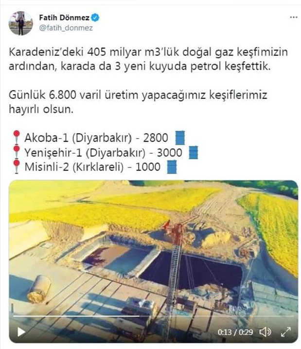 Diyarbakır'daki Akoba-1 kuyusundan 2 bin 800, Yenişehir-1 kuyusundan 3 bin ve Kırklareli'deki Misinli-2 kuyusundan günlük bin varil petrol üretileceğini kaydeden Dönmez, "Karadeniz’deki 405 milyar metreküplük doğal gaz keşfimizin ardından, karada da 3 yeni kuyuda petrol keşfettik. Günlük 6 bin 800 varil üretim yapacağımız keşiflerimiz hayırlı olsun." ifadesini kullandı.
