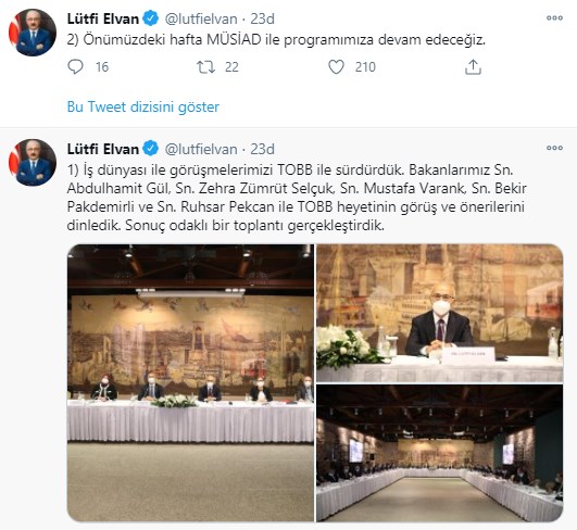 Toplantıyla ilgili sosyal medya hesabından açıklama yapan Elvan, "İş dünyası ile görüşmelerimizi TOBB ile sürdürdük. Bakanlarımız Sn. Abdulhamit Gül, Sn. Zehra Zümrüt Selçuk, Sn. Mustafa Varank, Sn. Bekir Pakdemirli ve Sn. Ruhsar Pekcan ile TOBB heyetinin görüş ve önerilerini dinledik. Sonuç odaklı bir toplantı gerçekleştirdik. Önümüzdeki hafta MÜSİAD ile programımıza devam edeceğiz" dedi.