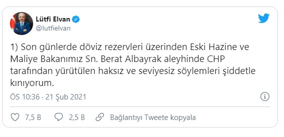 Hazine ve Maliye Bakanı Lütfi Elvan, "Son günlerde döviz rezervleri üzerinden eski Hazine ve Maliye Bakanı Berat Albayrak aleyhinde CHP tarafından yürütülen haksız ve seviyesiz söylemleri şiddetle kınıyorum" ifadesini kullandı.