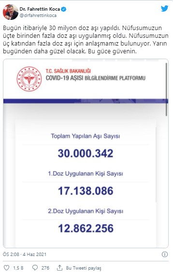 Kişisel Twitter hesabında açıklamada bulunan Koca, "Bugün itibariyle 30 milyon doz aşı yapıldı. Nüfusumuzun üçte birinden fazla doz aşı uygulanmış oldu" dedi.