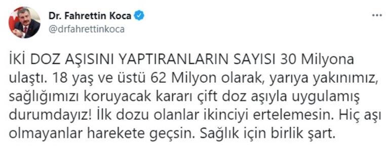 Açıklamasında Bakan Koca, "İKİ DOZ AŞISINI YAPTIRANLARIN SAYISI 30 Milyona ulaştı. 18 yaş ve üstü 62 Milyon olarak, yarıya yakınımız, sağlığımızı koruyacak kararı çift doz aşıyla uygulamış durumdayız! İlk dozu olanlar ikinciyi ertelemesin. Hiç aşı olmayanlar harekete geçsin. Sağlık için birlik şart." dedi.