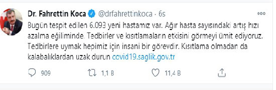 Sağlık Bakanı Fahrettin Koca, verilere ilişkin Twitter hesabından yaptığı paylaşımda, "Bugün tespit edilen 6 bin 93 yeni hastamız var. Ağır hasta sayısındaki artış hızı azalma eğiliminde. Tedbirler ve kısıtlamaların etkisini görmeyi ümit ediyoruz. Tedbirlere uymak hepimiz için insani bir görevdir. Kısıtlama olmadan da kalabalıklardan uzak durun." ifadelerini kullandı.