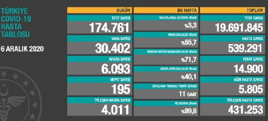 Türkiye Günlük Korona virüs Tablosu, "covid19.saglik.gov.tr" adresinden paylaşıldı. Güncel verilere göre, son 24 saatte 174 bin 761 Kovid-19 testi yapıldı, 30 bin 402 kişinin testi pozitif çıktı, hasta sayısı 6 bin 93 oldu.