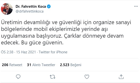 Bakan Koca sosyal medya hesabından yaptığı açıklamasında; "Üretimin devamlılığı ve güvenliği için organize sanayi bölgelerinde mobil ekiplerimizle yerinde aşı uygulamasına başlıyoruz. Çarklar dönmeye devam edecek. Bu güce güvenin." dedi.