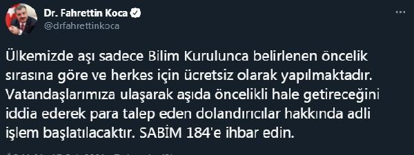 Bakan Koca, aşılarla ilgili Twitter hesabından yaptığı açıklamada, "Ülkemizde aşı sadece Bilim Kurulunca belirlenen öncelik sırasına göre ve herkes için ücretsiz olarak yapılmaktadır. Vatandaşlarımıza ulaşarak aşıda öncelikli hale getireceğini iddia ederek para talep eden dolandırıcılar hakkında adli işlem başlatılacaktır. SABİM 184'e ihbar edin" ifadelerini kullandı.