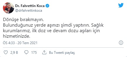 Sağlık Bakanı Fahrettin Koca, yeni tip korona virüse (Kovid-19) karşı vatandaşları aşı olmaya davet etti. Koca, kişisel Twitter hesabında yaptığı paylaşımda "Dönüşe bırakmayın. Bulunduğunuz yerde aşınızı şimdi yaptırın. Sağlık kurumlarımız, ilk doz ve devam dozu aşıları için hizmetinizde" ifadesini kullandı.