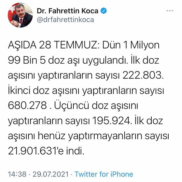 Bakan Koca, "Dün 1 milyon 99 bin 5 doz aşı uygulandı. İlk doz aşısını yaptıranların sayısı 222 bin 803. İkinci doz aşısını yaptıranların sayısı 680 bin 278. Üçüncü doz aşısını yaptıranların sayısı 195 bin 924. İlk doz aşısını henüz yaptırmayanların sayısı 21 milyon 901 bin 631’e indi" dedi.