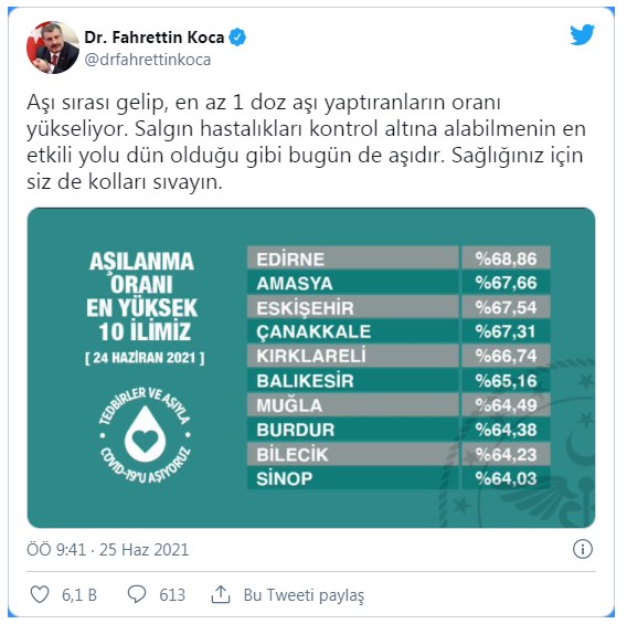 Koca, Twitter hesabından yaptığı paylaşımda, aşılama oranı en yüksek 10 ilin bulunduğu tabloya yer vererek, "Aşı sırası gelip, en az 1 doz aşı yaptıranların oranı yükseliyor. Salgın hastalıkları kontrol altına alabilmenin en etkili yolu dün olduğu gibi bugün de aşıdır. Sağlığınız için siz de kolları sıvayın." ifadelerini kullandı.