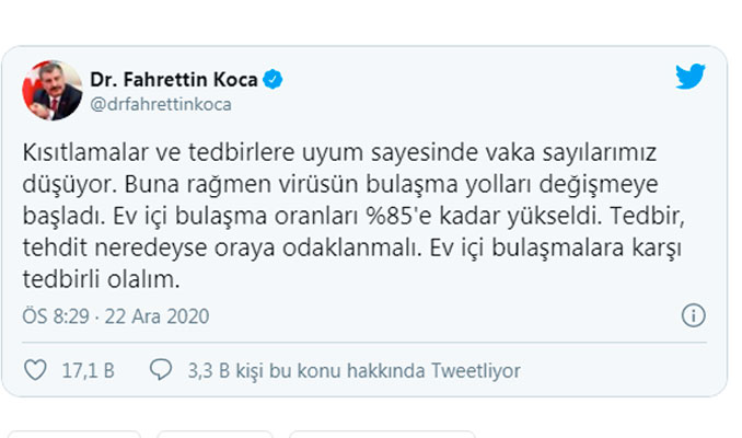 Sağlık Bakanı Fahrettin Koca, Twitter'dan yaptığı paylaşımda, ev içi bulaşma oranlarının yüzde 85 arttığına dikkat çekti.