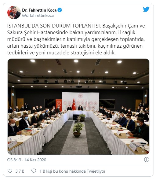 Sağlık Bakanı Fahrettin Koca Twitter hesabından, "İstanbul'da son durum toplantısı" başlığıyla yaptığı paylaşımda, Başakşehir Çam ve Sakura Şehir Hastanesinde bakan yardımcıları, il sağlık müdürü ve başhekimlerin katılımıyla toplantı gerçekleştirdiklerini kaydetti.