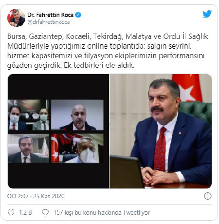 "Bursa, Gaziantep, Kocaeli, Tekirdağ, Malatya ve Ordu İl Sağlık Müdürleriyle yaptığımız online toplantıda; salgın seyrini, hizmet kapasitemizi ve filyasyon ekiplerimizin performansını gözden geçirdik. Ek tedbirleri ele aldık. Bursa, Kocaeli ve Gaziantep'te belirgin artış var. Bu illerimizde daha gayretli, daha titiz bir çalışma gerekiyor. Desteğinizin önemi artmış durumda. Mücadelemize desteğinizle güç verin."