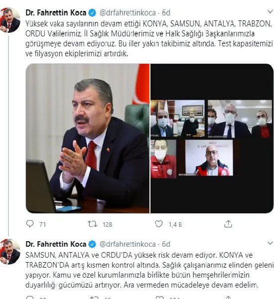 Koca 5 ille ilgili şu değerlendirmeyi yaptı: "Bu iller yakın takibimiz altında. Test kapasitemizi ve filyasyon ekiplerimizi artırdık. Samsun, Antalya ve Ordu'da yüksek risk devam ediyor. Konya ve Trazon'da ise artış kısmen kontrol altında. Sağlık çalışanlarımız elinden geleni yapıyor. Kamu ve özel kurumlarımızla birlikte bütün hemşehrilerimizin duyarlılığı gücümüzü artırıyor. Ara vermeden mücadeleye devam edelim'' ifadelerini kullandı.