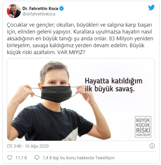 Sağlık Bakanı Fahrettin Koca, Twitter hesabından yaptığı açıklamada, "Çocuklar ve gençler; okulları, büyükleri ve salgına karşı başarı için, elinden geleni yapıyor. Kurallara uyulmazsa hayatın nasıl aksadığının en büyük tanığı şu anda onlar. 83 Milyon yeniden birleşelim, savaşa kaldığımız yerden devam edelim. Büyük küçük riski azaltalım. VAR MIYIZ?" dedi.