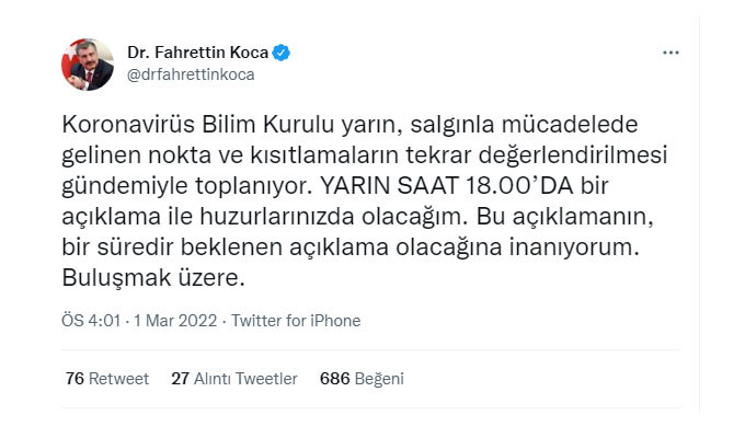 Bakan Koca açıklamasında, "Koronavirüs Bilim Kurulu yarın, salgınla mücadelede gelinen nokta ve kısıtlamaların tekrar değerlendirilmesi gündemiyle toplanıyor. Yarın saat 18.00'da bir açıklama ile huzurlarınızda olacağım. Bu açıklamanın, bir süredir beklenen açıklama olacağına inanıyorum. Buluşmak üzere." dedi.