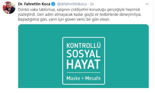 Bakan Koca, sosyal paylaşım sitesi Twitter hesabından yaptığı açıklamada, “Dünkü vaka tablomuz, salgının ciddiyetini koruduğu gerçeğiyle hepimizi yüzleştirdi. Geri adım atmayacak kadar güçlü ve tedbirlerde deneyimliyiz. Başladığımız gün, yarın için güven verici bir gün olsun” ifadesini kullandı. Koca ayrıca, ‘Kontrollü sosyal hayat, maske + mesafe’ ifadesinin yer aldığı fotoğrafı paylaştı.