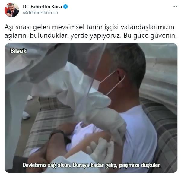Sağlık Bakanı Koca, Twitter hesabından yaptığı açıklamada, aşı sırası gelen mevsimlik tarım işçilerinin aşılarını bulundukları yerde yaptırabileceklerini belirterek "Aşı sırası gelen mevsimsel tarım işçisi vatandaşlarımızın aşılarını bulundukları yerde yapıyoruz. Bu güce güvenin" ifadelerini kaydetti.
