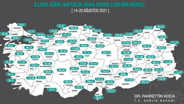 Sosyal medya hesabından haritayı paylaşan Koca, "14-20 Ağustos arasında, 100.000 kişi içinde bir haftalık toplam yeni Covid-19 vaka sayısı neydi? Yaşadığınız veya gidip geldiğiniz ildeki durumu haftalık İnsidans haritamızdan öğrenebilirsiniz. Son haritaya göre yeni vaka yoğunluğunun en yüksek olduğu il Rize" dedi.
