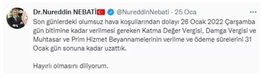 "Son günlerdeki olumsuz hava koşullarından dolayı 26 Ocak 2022 Çarşamba gün bitimine kadar verilmesi gereken Katma Değer Vergisi, Damga Vergisi ve Muhtasar ve Prim Hizmet Beyannamelerinin verilme ve ödeme sürelerini 31 Ocak gün sonuna kadar uzattık. Hayırlı olmasını diliyorum."