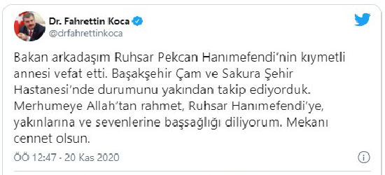Bakan Elvan Twitter'dan, "Ticaret Bakanımız Ruhsar Pekcan Hanımefendi'nin annesinin vefatını üzüntüyle öğrendim. Merhumeye Allah'tan rahmet, kıymetli Bakanımıza ve yakınlarına sabırlar diliyorum. Mekanı cennet olsun inşallah." paylaşımında bulundu.
