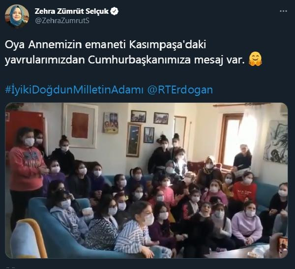Cumhurbaşkanı Erdoğan'ın doğum gününü kutlayan çocukların olduğu bir video paylaşan Selçuk, "Oya Annemizin emaneti Kasımpaşa'daki yavrularımızdan Cumhurbaşkanımıza mesaj var. İyi ki doğdun Milletin Adamı Recep Tayyip Erdoğan" ifadelerini kullandı.