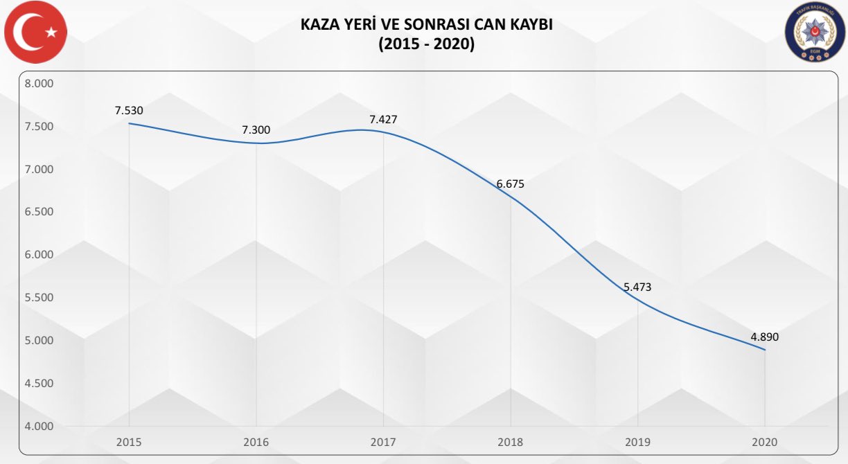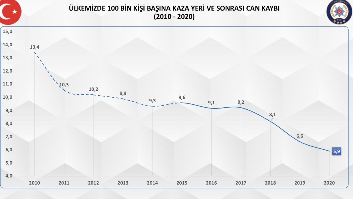 Bakan Soylu, Twitter hesabından yaptığı açıklamada, "Trafikte ölümler; tedbir, denetim, eğitim, iyileşen yollar, teknolojik ve acil sağlık müdahale kapasitesiyle, milletimizin dikkatiyle son 10 yılda yüzbinde 13.4’ten 5.9’a düştü. 2020 yılı ölümü, son 10 yılın en düşüğünde; 4 bin 890. Cumhurbaşkanımızın liderliğinde; her yıl daha iyiye" dedi.