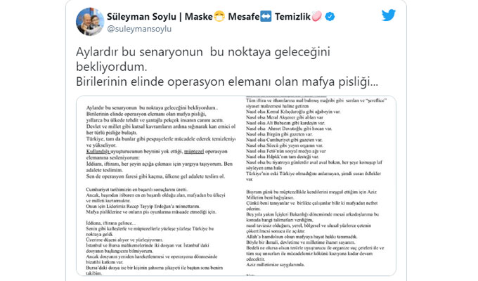 İçişleri Bakanı Süleyman Soylu, Sedat Peker'in iddialarıyla ilgili Twitter'dan açıklama yaptı.