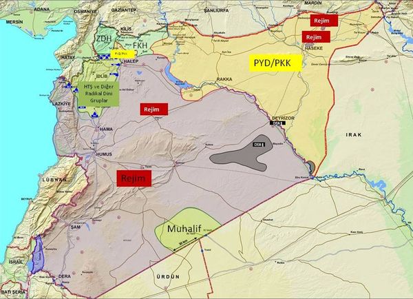 Suriyeliler dönsünler deniyor ama nereye dönecekler? Harita üzerinden bakalım. (Üstte) Ortadaki gri alan rejim bölgesi, bunlar zaten rejimden kaçmışlar. Avrupa Birliği de dâhil olmak üzere bütün dünya, Lübnan sınırında oluşturulan bölgeye “Geri dönün” diyor. Büyük bir kampanya yürütülüyor. Şu ana kadar sadece 70 bin kişi döndü. Bizde bir kampanya yok, fakat son 2 yıl içinde bizden, haritada ZDH ve FKH olarak belirtilen Zeytin Dalı ve Fırat Kalkanı harekâtlarının olduğu toplam 4 bin kilometrekarelik bölgeye 294 bin kişi döndü. Bütün dünya buradan dönsünler diye kampanya yapıyor. “Suriye normalleşti, Lübnan’dan dönüyorlar, Türkiye’den niye dönmüyorlar?” şeklinde bir fitne oluşturmaya çalışanlar var. Peki, bu insanlar nereye dönecekler? Rejim, PYD-PKK, DEAŞ, HTŞ ve diğer radikal gruplar arasında parçalanan bu haritada; bu insanlar nereye dönsünler? Bir gece yatacaklar, ertesi gün DEAŞ’cılarla, El-Nusra’cılarla, PKK-PYD’cilerle beraber, Amerikan askerleriyle beraber kalkacaklar. Bunu açık yüreklilikle tartışmamız gerekiyor. “Ben siyaset yapıyorum, bundan kaçayım” diyemeyiz. Ben siyasetten önce insanım. Tayyip Erdoğan, bütün bu hadisenin sadece Suriye fotoğrafını görmüyor, dünya fotoğrafını görüyor ve biz bunu ilk kez bugün yapmıyoruz. Biz bunu Selanik’te soydaşlarımıza ve dindaşlarımıza yaptık... Bulgaristan’da yıllarca yan yana olan komşuların birbirlerini öldürmeye nasıl teşebbüs ettiğini ve öldürtmek için ihbar ettiklerini bildiğimiz bir tarihten geliyoruz. Buralar başka bir memleket değil, bizim memleketimiz. Dönebilen dönüyor.