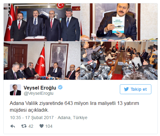 Adanalılara müjdeli haberi veren Veysel Eroğlu Twitter hesabından yaptığı paylaşımda, "Adana Valilik ziyaretinde 643 milyon lira maliyetli 13 yatırım müjdesi açıkladık" dedi.