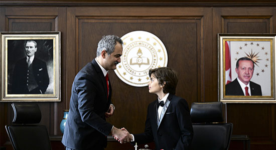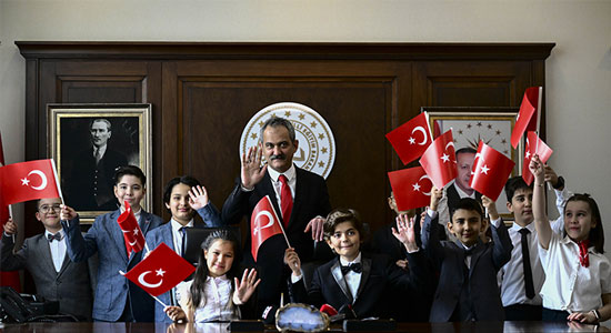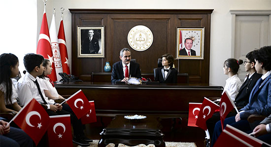 Milli Eğitim Bakanı Mahmut Özer, TBMM'nin açılışının 103'üncü yıl dönümü ile 23 Nisan Ulusal Egemenlik ve Çocuk Bayramı dolayısıyla çeşitli okullardan gelen öğrencileri makamında kabul etti.