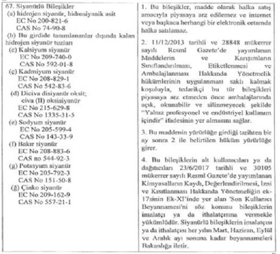 Yönetmeliğin ekinde yer alan "Belirli Zararlı Maddelerin, Karışımların ve Eşyaların İmalatı, Piyasaya Arzı ve Kullanımı Hakkında Kısıtlamalar" başlığına da yeni maddeler getirildi. Buna göre: Siyanürlü bileşikler; hidrojen siyanür, hidrosiyanik asit, tanımlar dışında kalan hidrojen siyanür tuzları, kalsiyum siyanür, kadmiyum siyanür, diciva siyanür oksit; civa (II) oksisiyanür, sodyum siyanür, bakır siyanür, potasyum siyanür ve çinko siyanür, madde olarak halka satış amacıyla piyasaya arz edilemeyecek ve internet veya başkaca herhangi bir elektronik ortamda halka satılamayacak. Tedarikçi, bu tür bileşikleri piyasaya arz etmeden önce ambalajlarında açık, okunabilir ve silinmeyecek şekilde, "Yalnız profesyonel ve endüstriyel kullanım içindir" ifadesinin yer almasını sağlayacak.