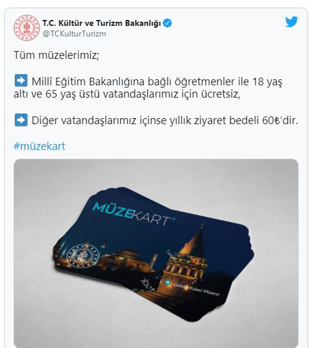 Bakanlığın Twitter hesabından yapılan açıklamada, "Tüm müzelerimiz; Milli Eğitim Bakanlığına bağlı öğretmenler ile 18 yaş altı ve 65 yaş üstü vatandaşlarımız için ücretsiz, diğer vatandaşlarımız içinse yıllık ziyaret bedeli 60 TL'dir" denildi.