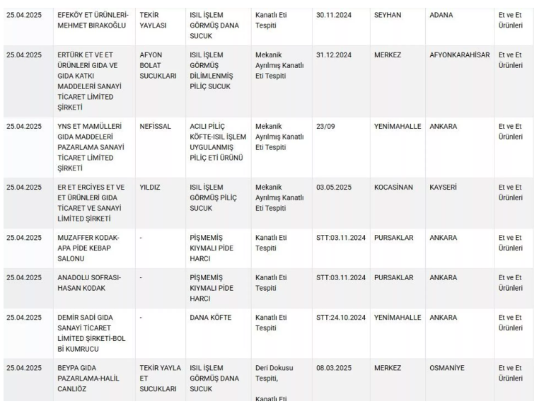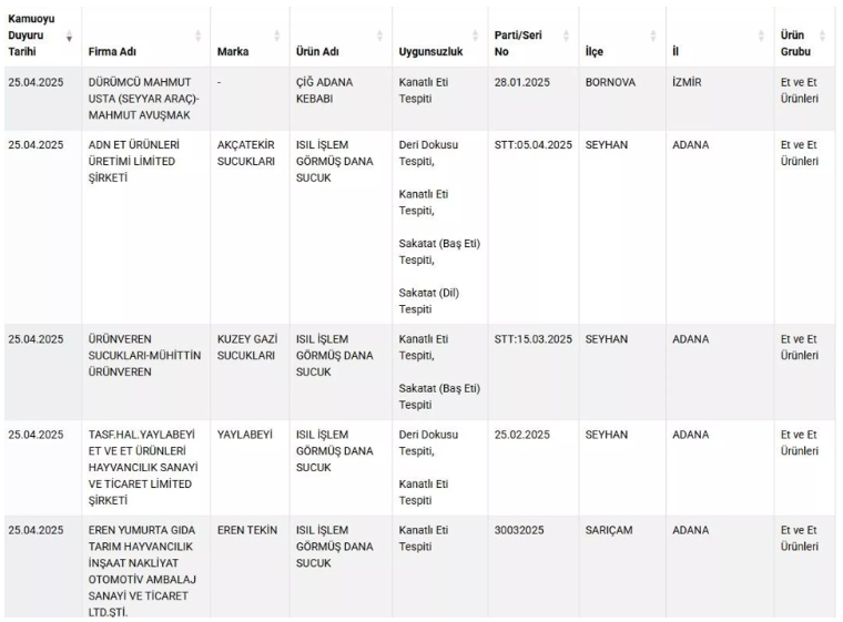 Yapılan analizlerde, bu ürünlerde dana eti yerine baş eti, deri dokusu, kanatlı eti ve sakatat gibi tüketiciye belirtilmeyen içeriklere rastlandı.