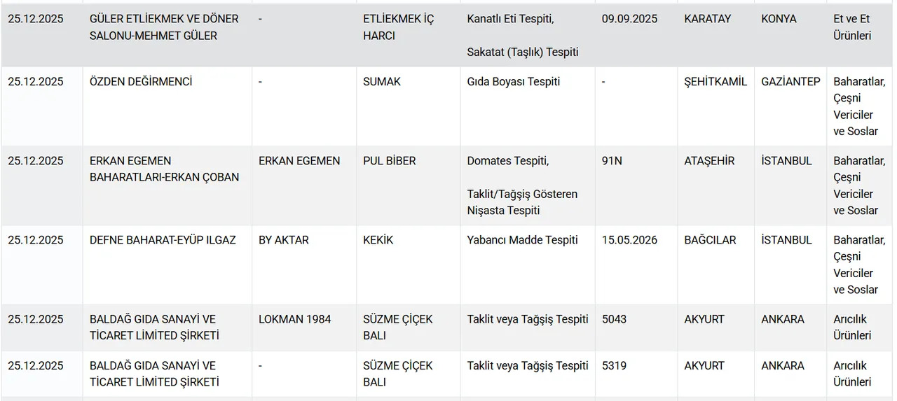 Güncellenen listede özellikle baharat ürünleri dikkat çekti. Sumak, isot ve kırmızı biber gibi ürünlerde, mevzuata aykırı şekilde gıdada kullanımına izin verilmeyen boyaların kullanıldığı belirlendi. Kekikte yabancı maddeye, pul biberde ise domates karışımına rastlandı.