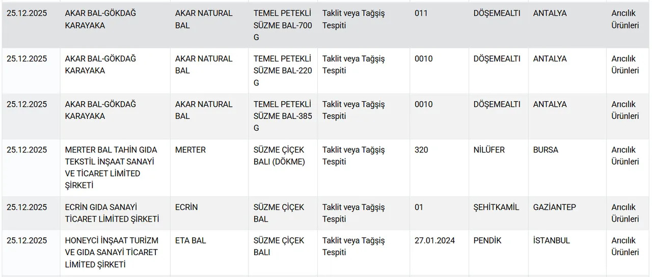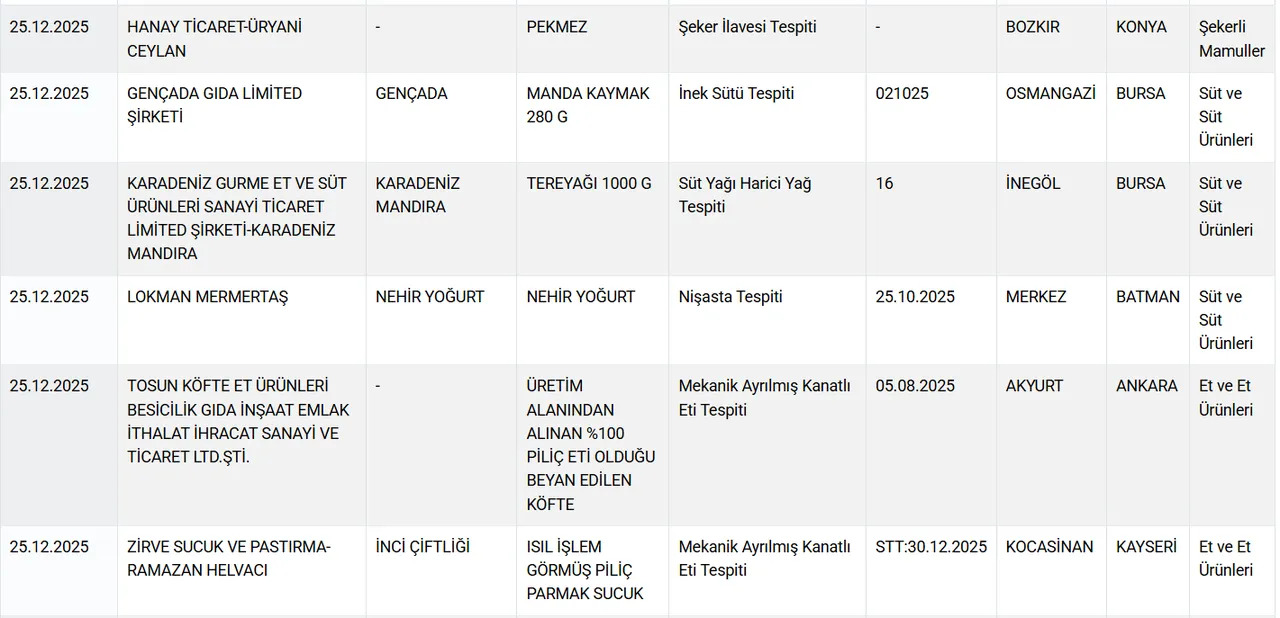 Pekmez, manda kaymağı, yoğurt ve sucuk gibi ürünlerde de taklit ve tağşişe rastlandı. Kaşar peynirinde yapılan incelemelerde ise ürün içeriğinin mevzuata uygun olmadığı belirlendi. Bal ürünlerinde de taklit ve katkı tespitleri listede yer aldı.
