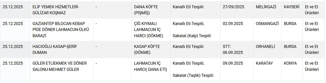 Denetimlerde köfte ve lahmacun gibi ürünlerde kanatlı eti tespit edildi. Tüketiciye kırmızı et ürünü olarak sunulan bu gıdalarda farklı hayvansal içeriklerin kullanıldığı ortaya kondu.