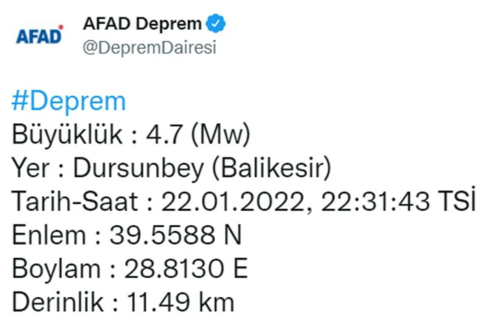 AFAD tarafından yapılan açıklamaya göre Balıkesir Dursunbey’de 4.7 büyüklüğünde deprem meydana geldi. Saat 22.31’de meydana gelen depremin derinliği 11.49 km olarak açıklandı.