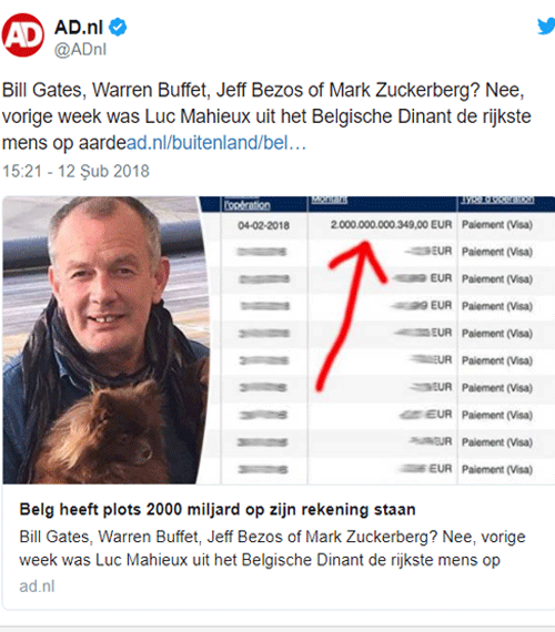 Belçika'da Luc Mahieux isimli bir kişinin hesabına banka hatası dolayısıyla 2 trilyon euro yatırıldı. Mahieux'un zenginliği ise çok uzun sürmedi.