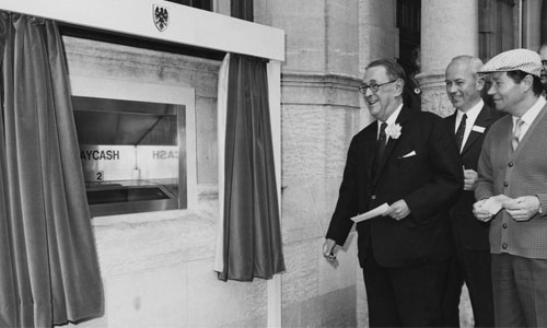27 Haziran 1967 günü Londra'daki Barclays bankasının Enfield şubesinde hizmete giren ilk ATM'den madeni birlikler halinde 5 sterlin çekilmişti.